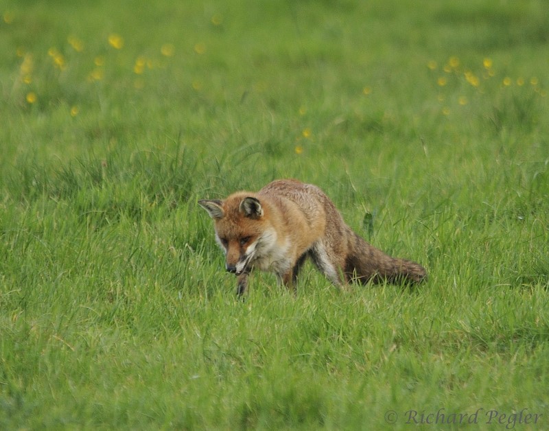 I only saw two owls that evening, with no meaningful photography. However, at the second location, where I'd decided I wouldn't enter the field because of the presence of cows with calves and a bull (!), I heard a Little Owl calling and saw that it was sending out a warning to its mate about an approaching Fox - the nest cavity here is at a relatively low level. It was at this time that the cattle decided to take themselves off through a gateway into an adjacent field that was out of view of my position. Feeling a little concerned for the safety of the owls I took my courage in both hands and entered the field. As I approached the Fox, it didn't seem to take a blind bit of notice of me.
