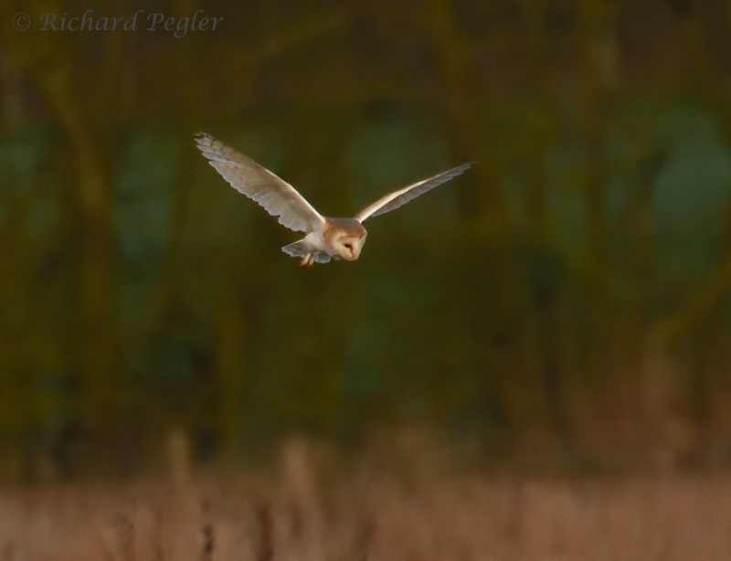 NOTE 2.: I've found the Barn Owls particularly difficult to photograph at this site as it is the norm for them to come out when the sun is out, but very low. One of the main difficulties is avoiding burn-out of the whites. Whilst they are flying, sometimes they are in the sun, with a background that is totally in shade, and a moment later they can be in shade with the background in sun. One second the sun is in front of them and a few seconds later it's directly behind them. They're below the horizon and then in a flash they're above the horizon. I don't think that I've ever worked so hard changing camera settings on the fly!